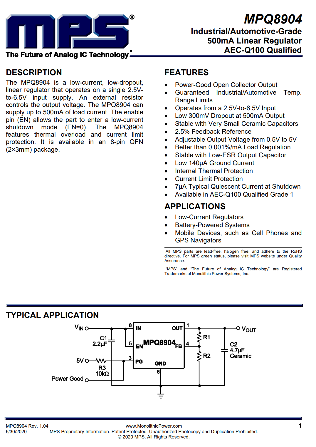 MPS MPQ8904 线性稳压器,符合AEC-Q100等级1认证。支持最高6.5V输入电压,输出电流最大500mA。