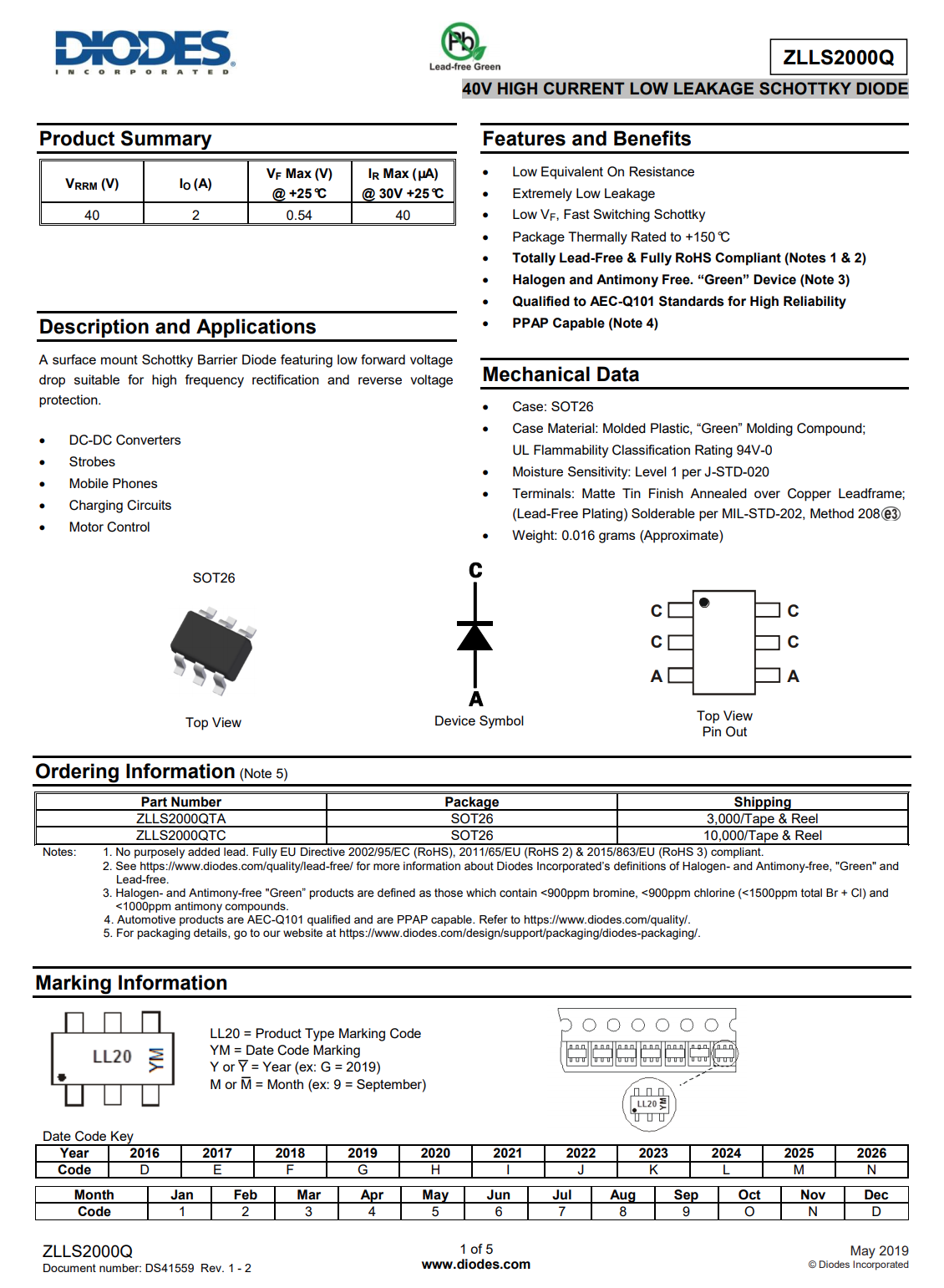 DIODES ZLLS2000Q 肖特基二极管,耐压40V,电流2A。