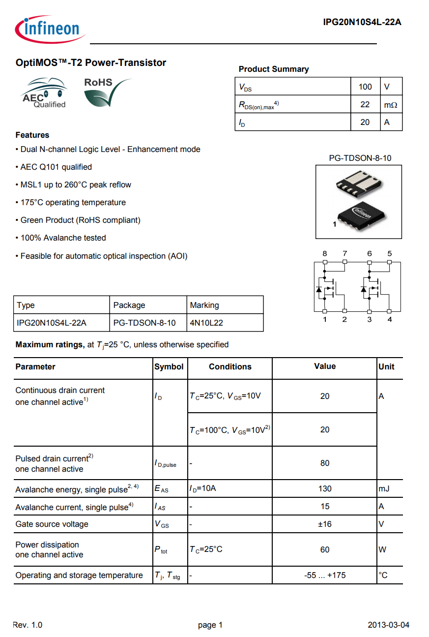 英飞凌 IPG20N10S4L-22A 详细资料。