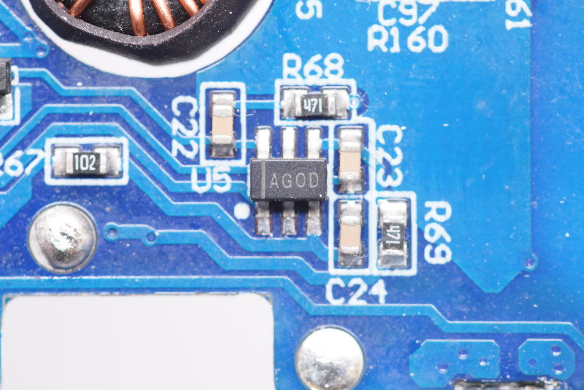 两颗主控芯片同时也是移动电源主控芯片,不过信息不详。另外采用永铭和云星小体积电容进行输入输出滤波,帮助压缩体积。另外充电器内部设有热敏电阻进行温度监控,主要发热器件也都配有散热片和导热垫帮助散热,整体用料做工都比较讲究。