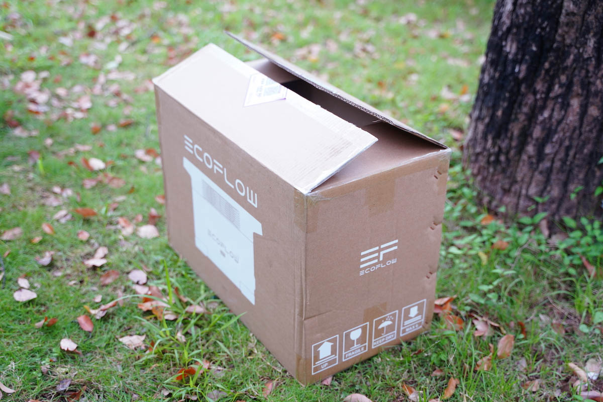 整个 德 DELTA mini 户外电源使用牛皮纸箱包装,四周印着品牌名称和基本的参数信息。