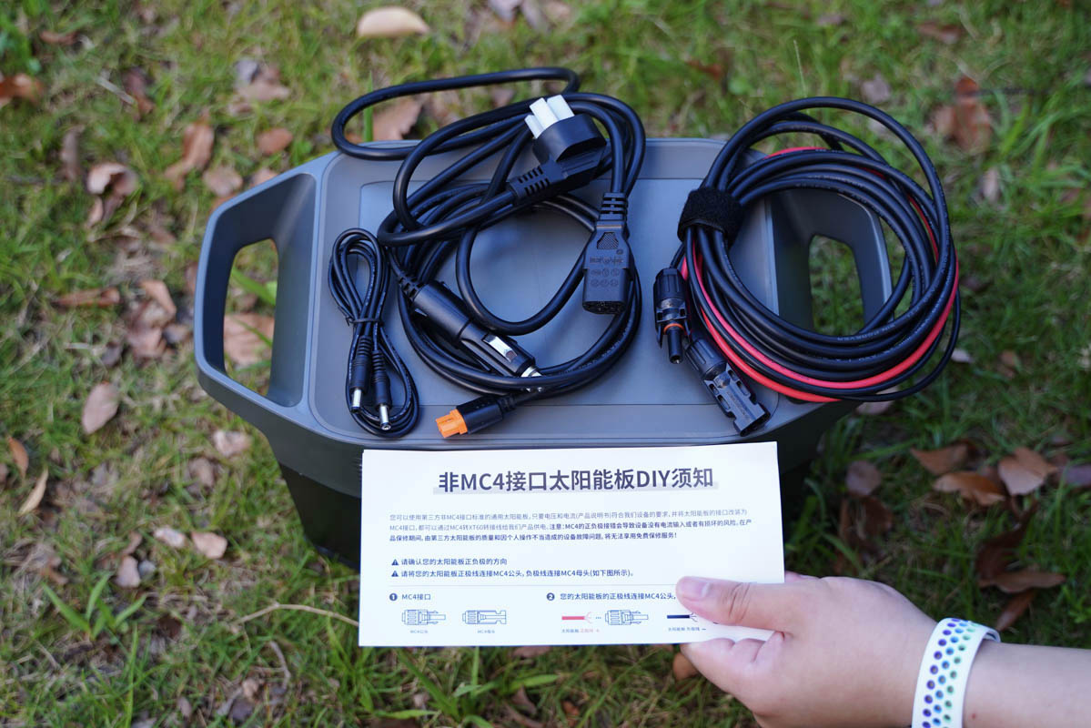 这就是包装盒内的所有产品了, 德 DELTA mini 户外电源、AC电源线、DC to DC线材、车充充电线以及用于连接太阳能电池板的线材。