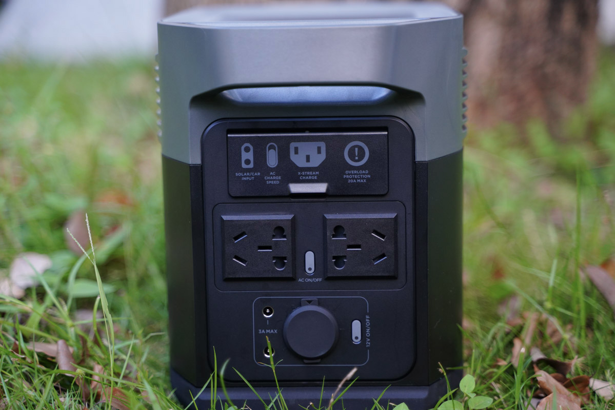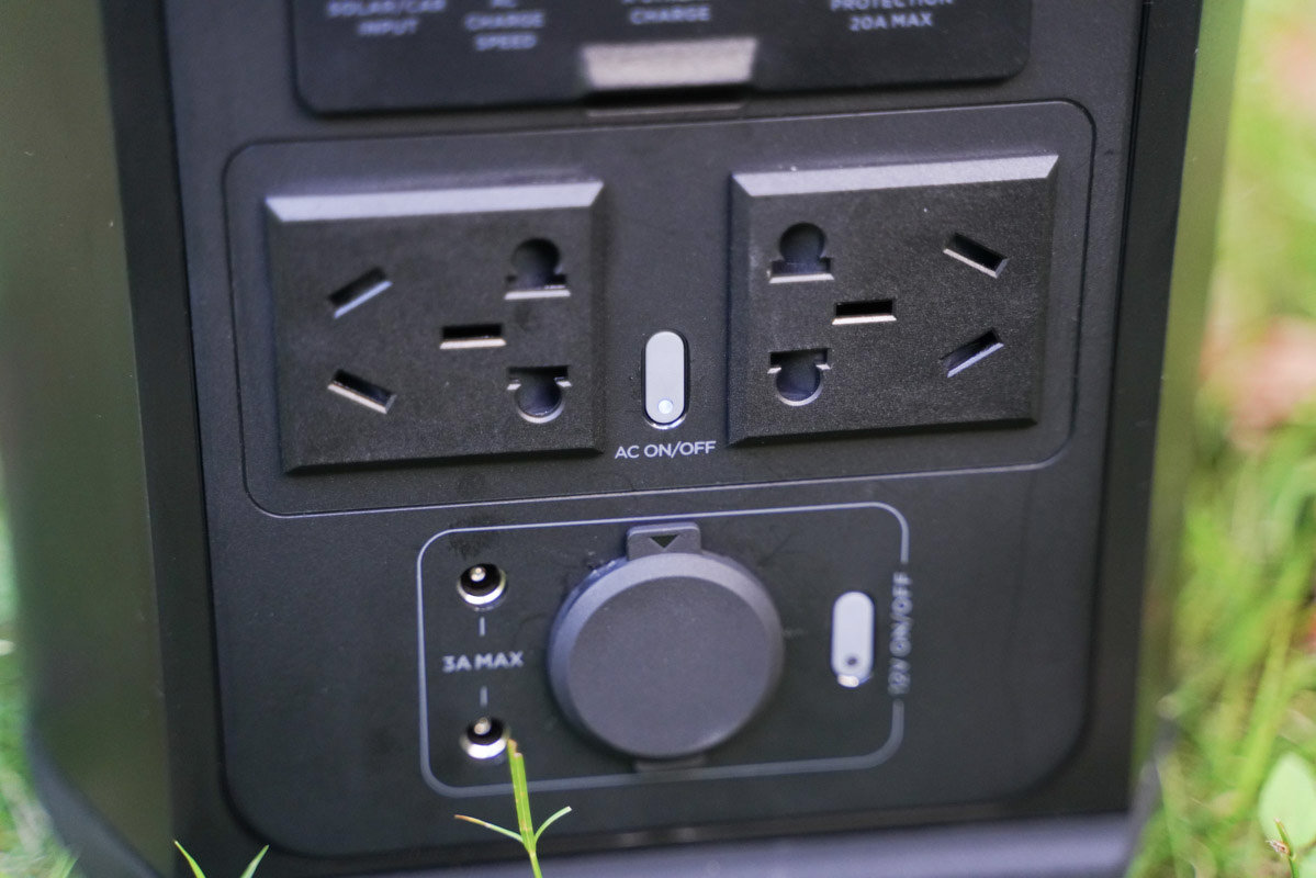 上方是为户外电源充电的接口部分,带有保护盖可以防止异物进入。从左到右分别为大电流太阳能和车充直流输入接口;快速充电/自定义充电设置切换开关;品字交流电输入接口以及过载保护开关。