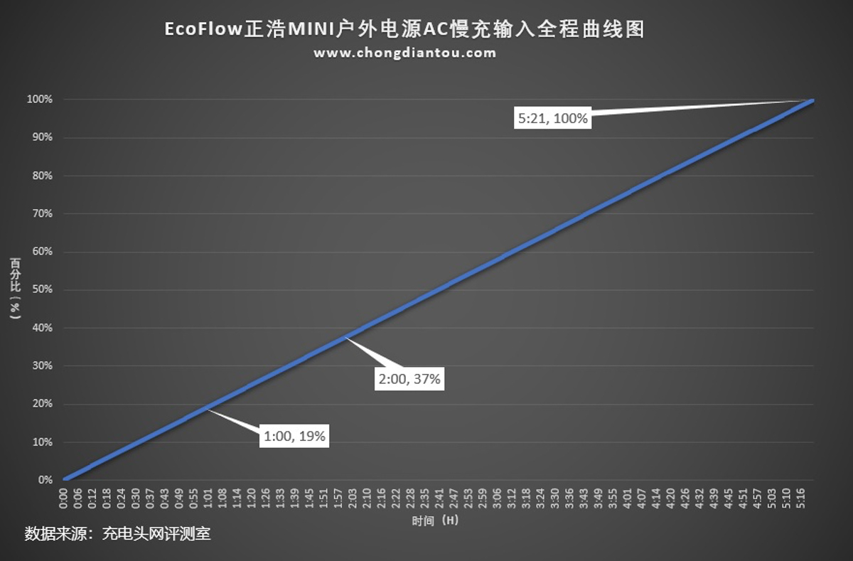 此次还采集了 德 DELTA mini 户外电源通过AC电源线输入的全程数据并绘制成了曲线图,测试了 德 DELTA mini 户外电源快充和静音充电两种自充电模式,上面的曲线图是静音充电全程,整个充电全程持续了大约5小时21分左右。
