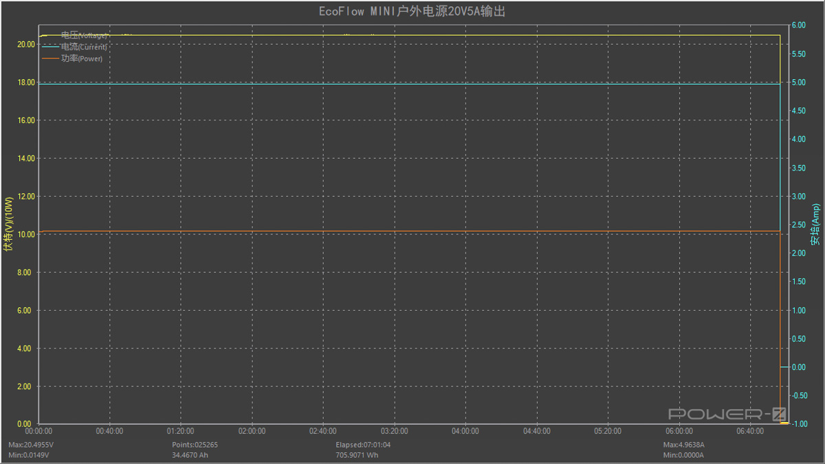 这里测试了一下 德 DELTA mini 户外电源的USB输出,让 德 DELTA mini 户外电源通过USB-C以20V5A 100W的功率持续输出,整个过程持续了约7小时左右。