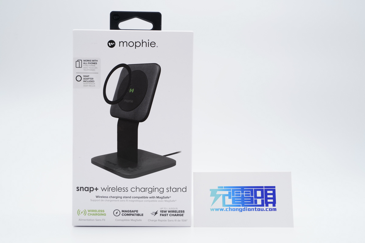这是 mophie 新款立式磁吸无线充的包装盒,从正面可以看出这款产品的外观形态,下面是这款产品的具体英文名称:snap+wireless charging stand,下面以立式磁吸无线充电器代替。