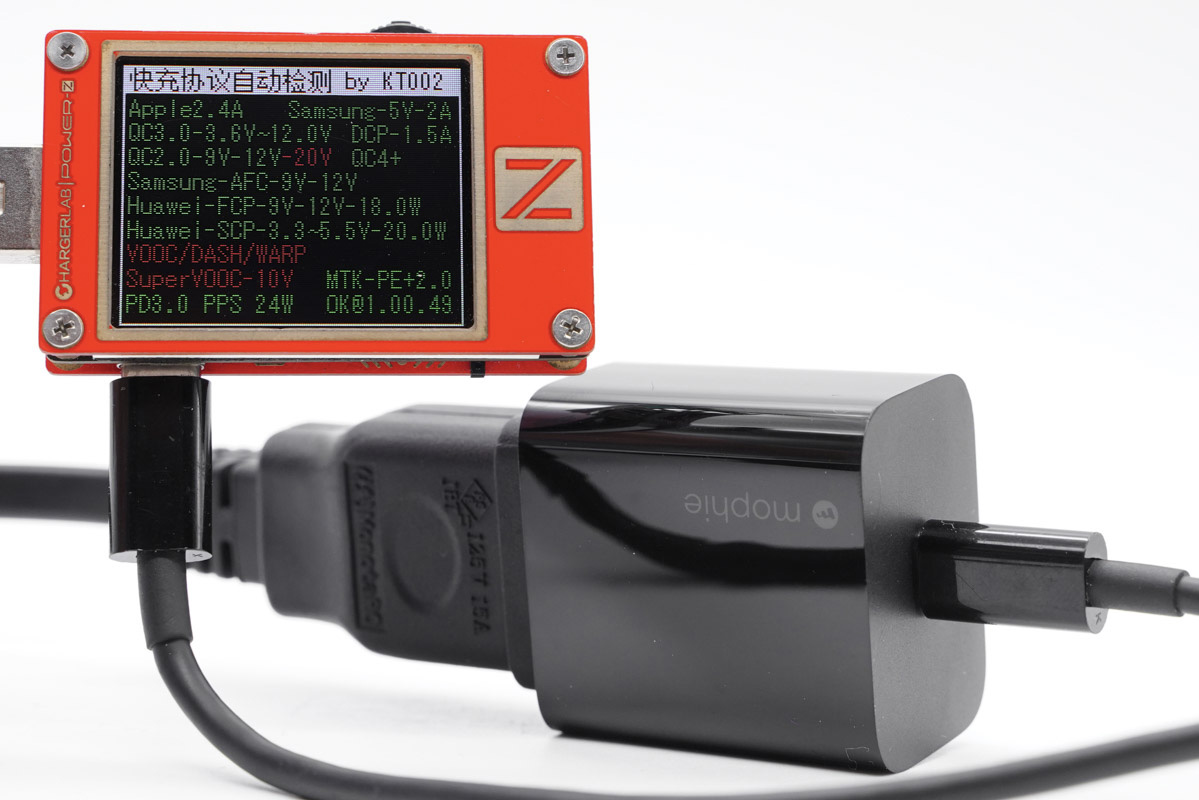 使用 ChargerLAB 的 POWER-Z KT002 读取充电器的快充协议,实测支持 PD、PPS、Apple2.4A、QC2.0、QC3.0、QC4+、AFC、FCP、SCP、MTK-PE等快充协议。