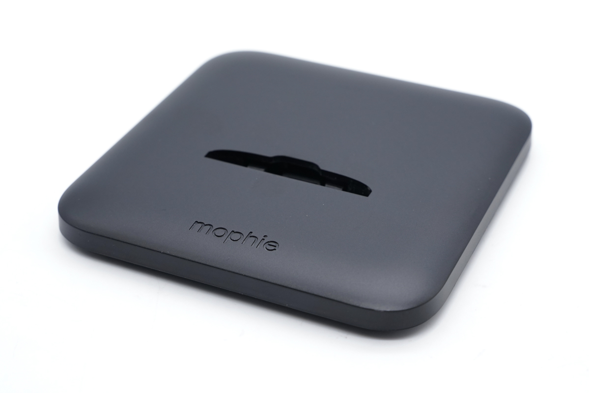 这是 mophie 磁吸无线充电器的侧面图,无线充电器呈现一定的倾斜角度,方便用户将手机放上去以更好的姿态查看。