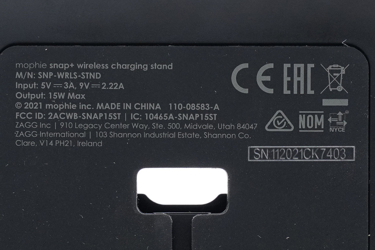 底座背面印着具体的参数详情,支持 5V3A、9V2.22A最高 20W 输入,输出最高 15W。