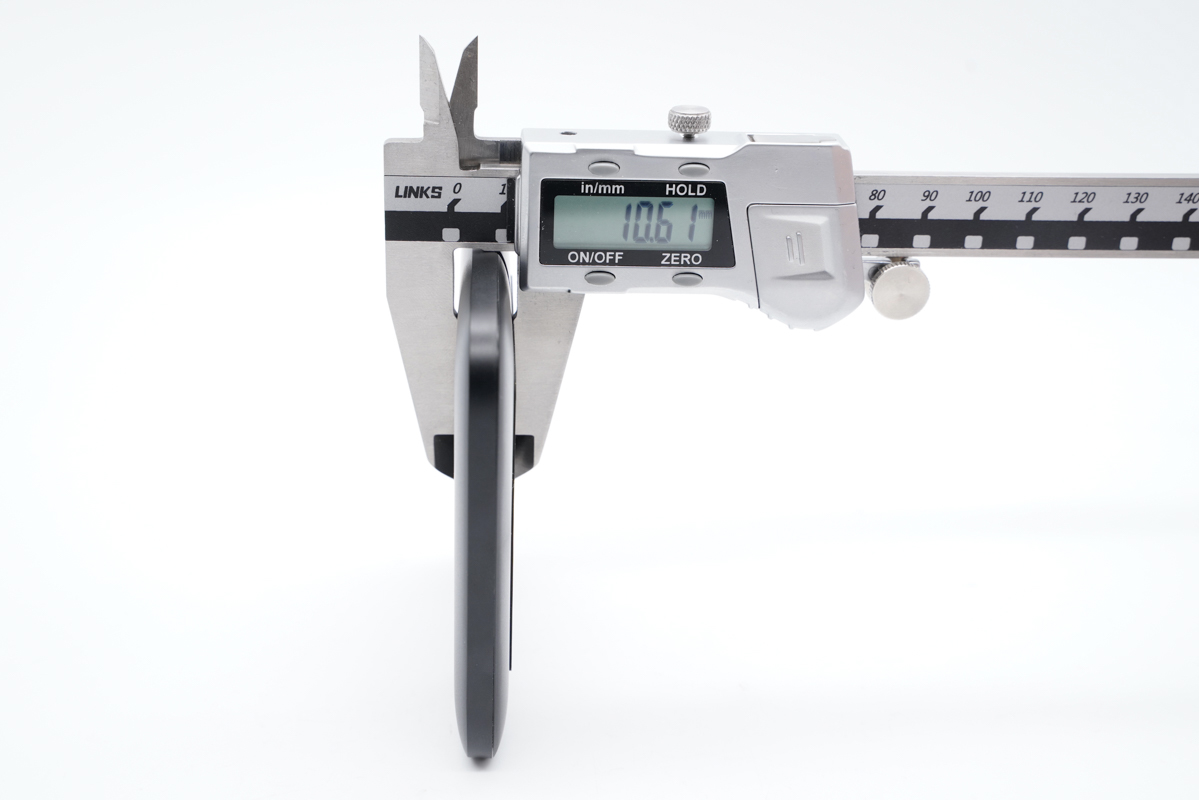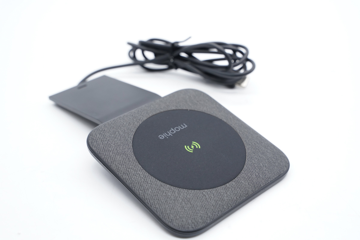 磁吸无线充电板正面,中间黑色位置为橡胶材质,吸附手机时防止划伤背板,四周灰色部分为日本东丽布艺覆盖,这一材质也在 mophie 的很多无线充电产品中见到过。