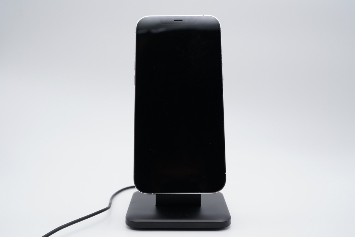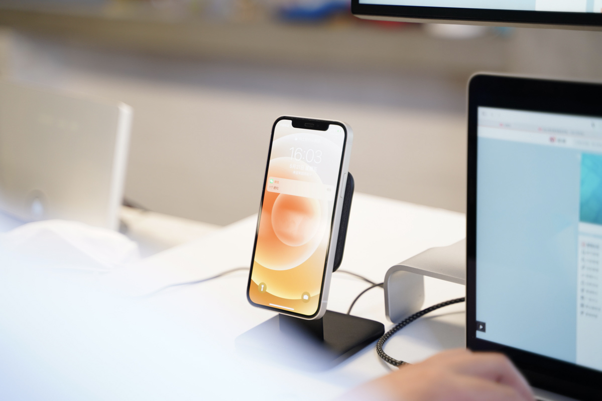 将 mophie 立式磁吸无线充电器放在桌面上,利用磁吸效果可以直接将 iPhone 12 放在上面充电。