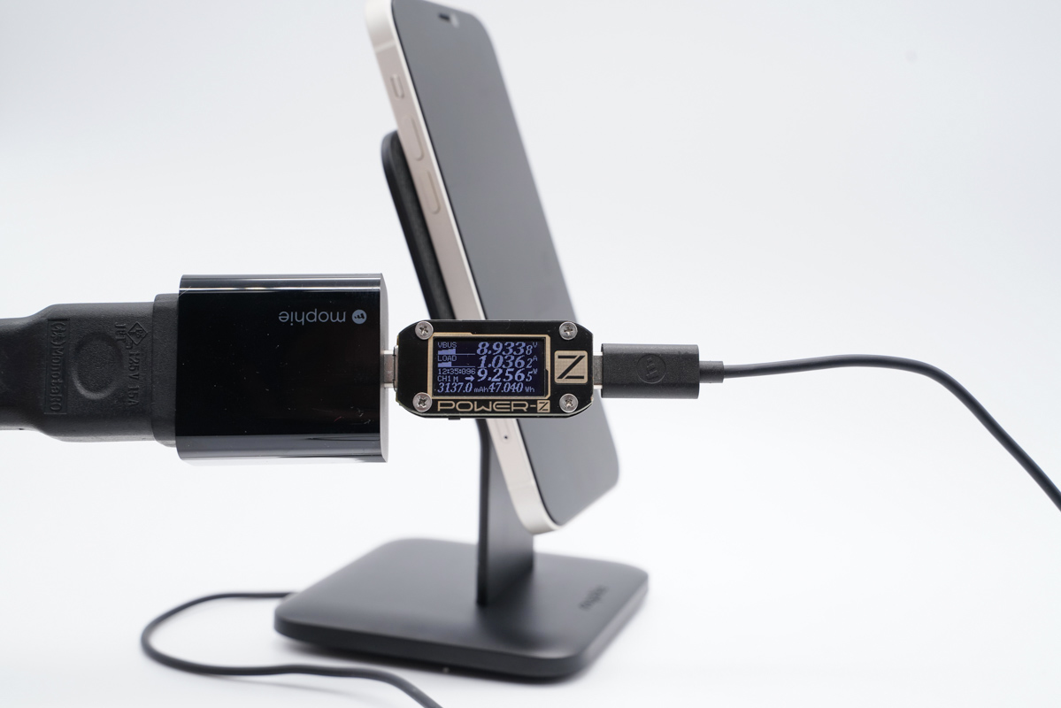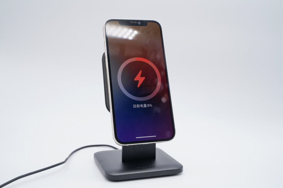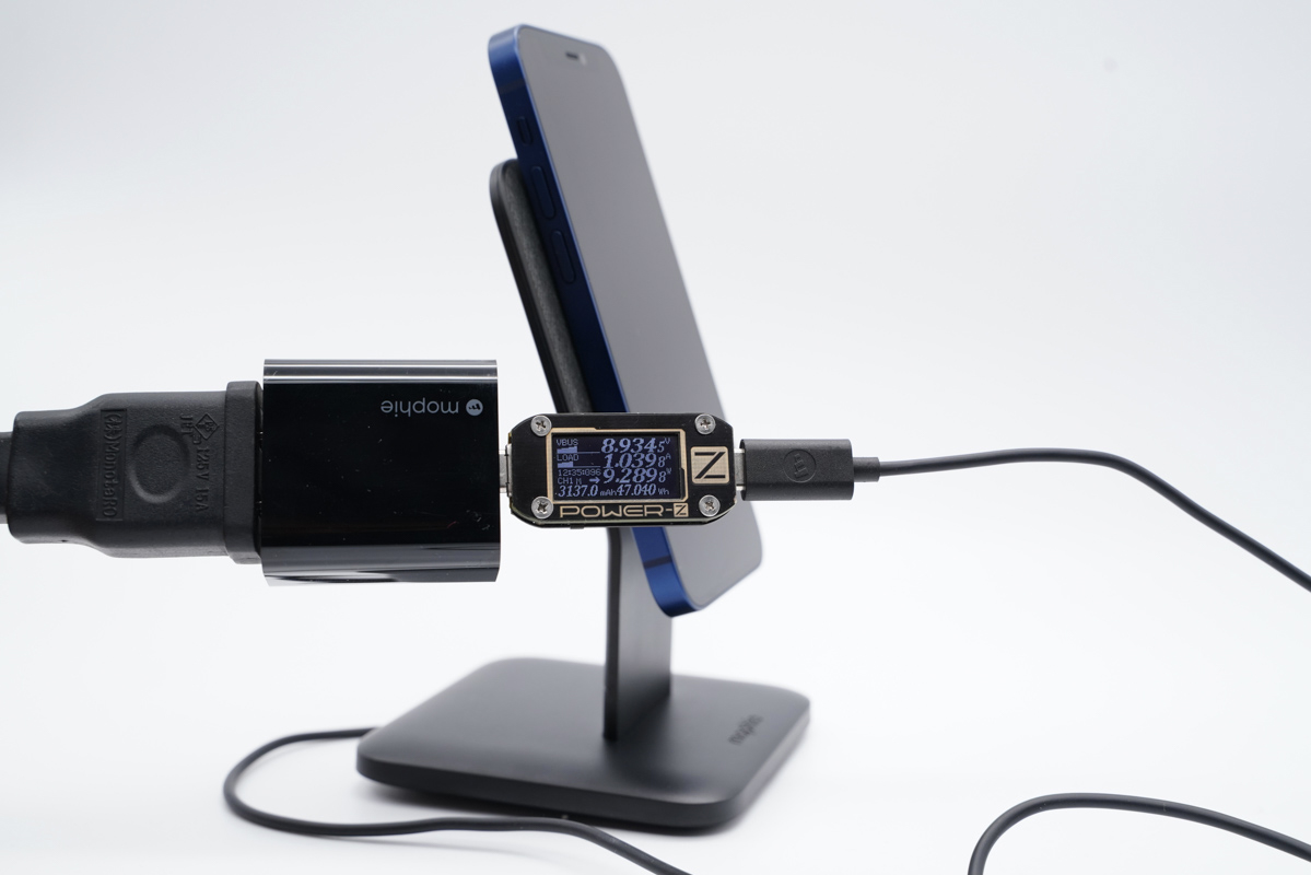 使用 mophie 立式磁吸无线充电器搭配附带的 20W 充电器为 iPhone 12 无线充电,实测输出电压为 9V,功率为 9.25W。
