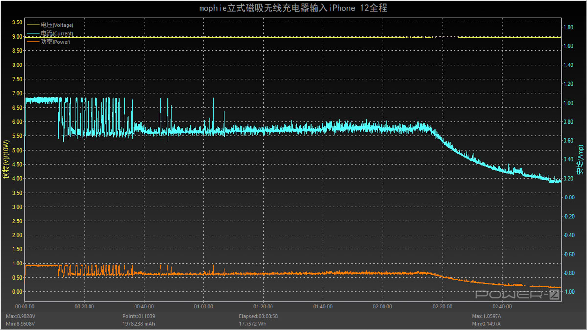 将 mophie 立式磁吸无线充电器放在 25℃的恒温箱内,使用其为 iPhone 12 充电。约 12 分钟前功率处于 9W 左右;到 37 分钟之间功率在 6W-9W 左右出现有规律的波动状态。37 分钟到 2 小时 14 分钟功率在 6W 左右。随后功率和电流逐渐下降直至充电结束,全程耗时约 2 小时 56 分,最高功率为 8.97V 1.05A 9.47W。
