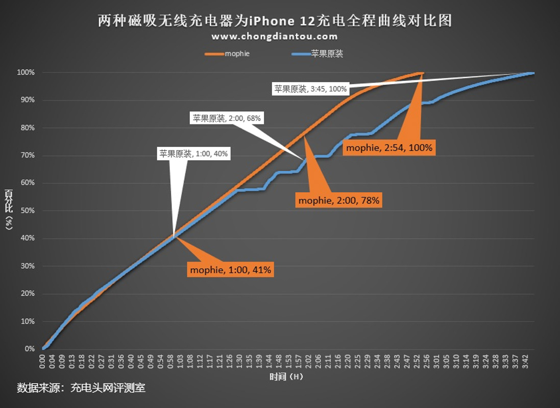 这是小编汇总的 mophie 立式磁吸无线充电器与苹果原装 MagSafe 磁吸无线充电器为 iPhone 12 充电全程的曲线图,可以看出在 1 小时的时间点上二者几乎相同,时间向后推移差距逐渐明显,2 小时mophie 立式磁吸无线充电器充电 78%,而苹果原装 MagSafe 磁吸无线充电器充电 68%。全程充电上 mophie 也要领先近 1 小时。