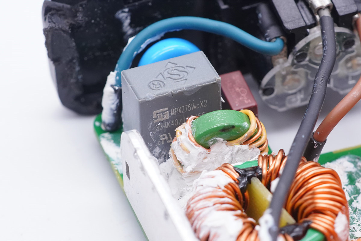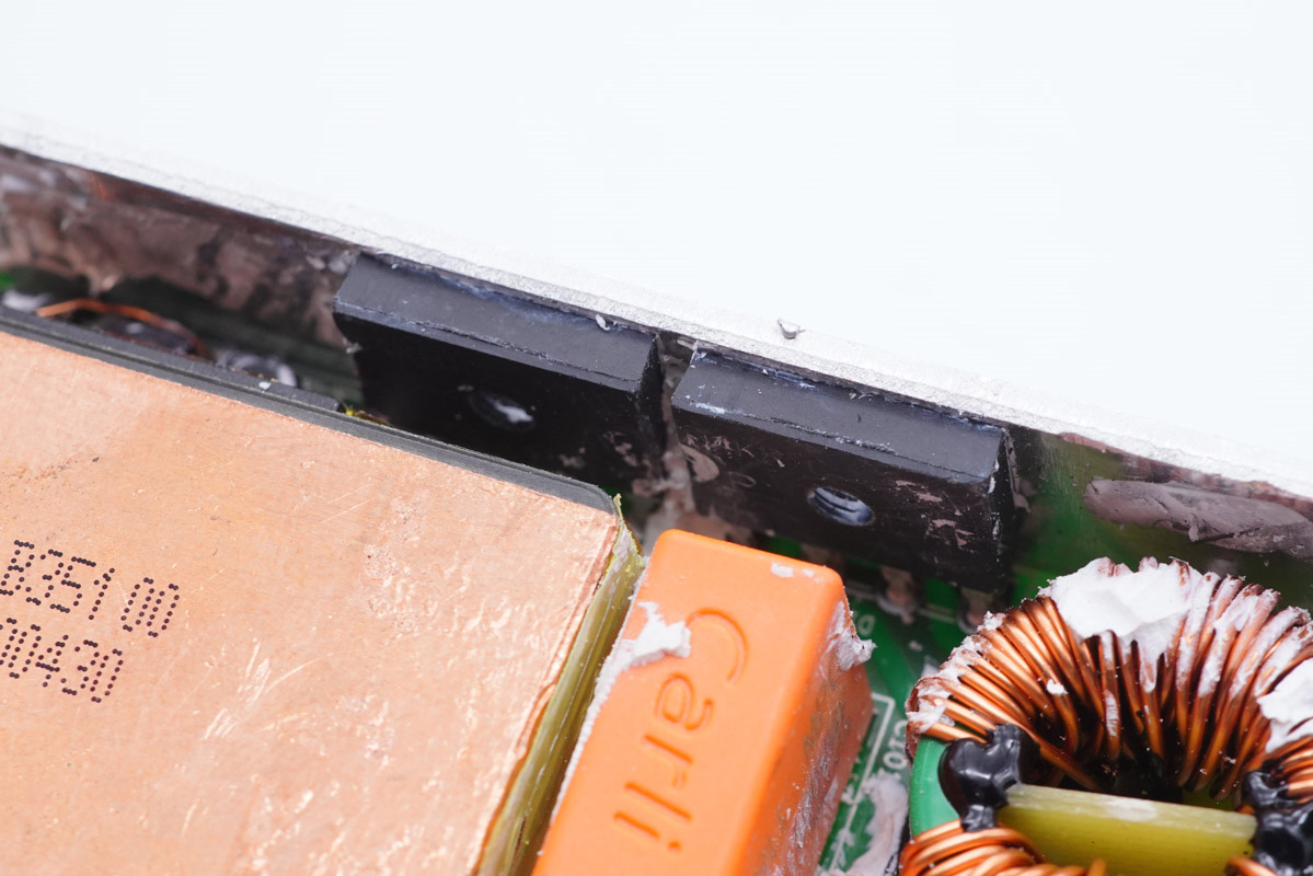 充电头网通过拆解了解到,作为一款大功率电源,在散热方面也尤为注重,整个PCBA模块包裹铝板和铜板进行散热,整流桥、PFC升压开关管而外配有散热片,高压开关管、同步整流管打胶帮助导热。
