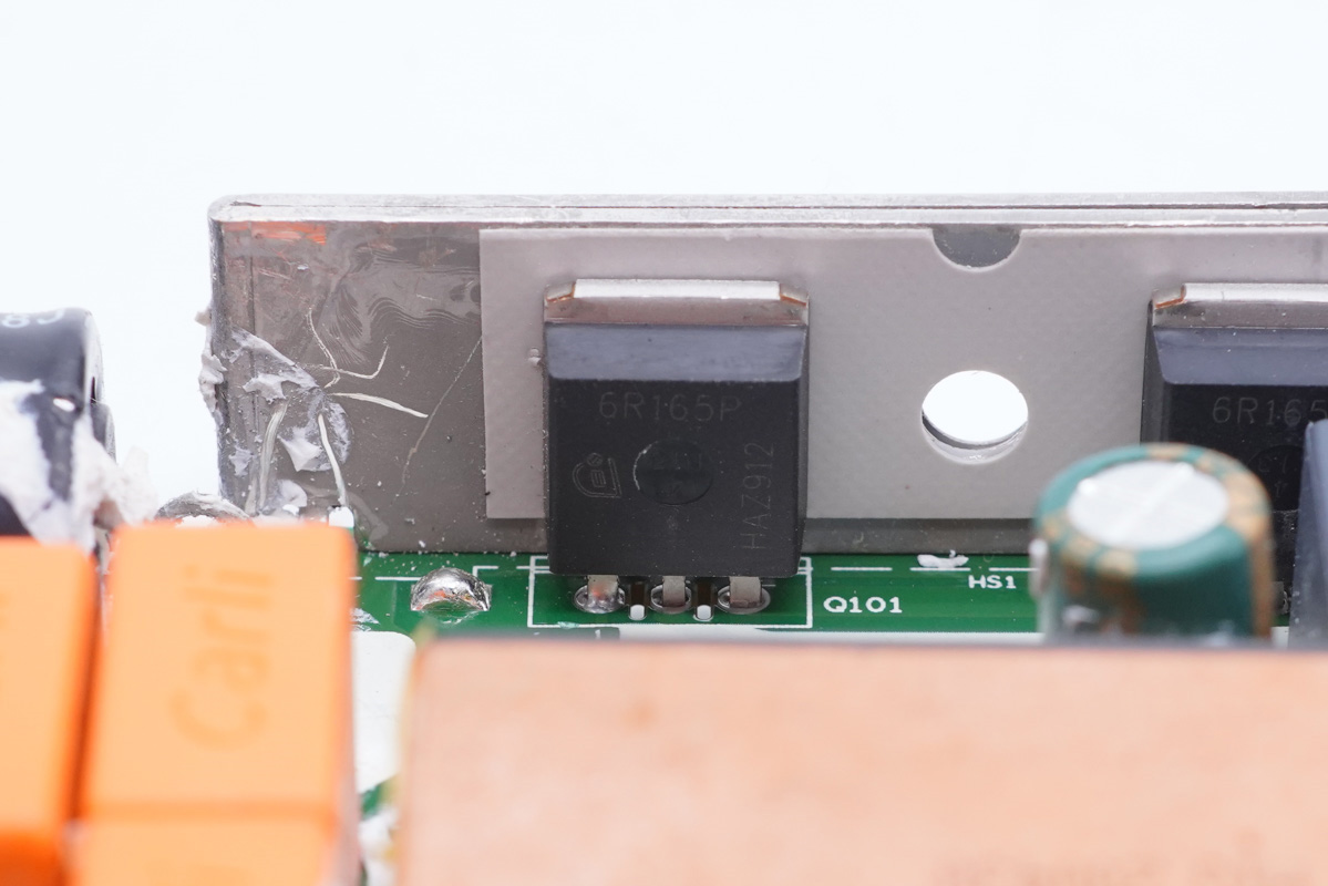 主板背面,PFC升压整流管、初级开关管以及同步整流管均打胶帮助导热。