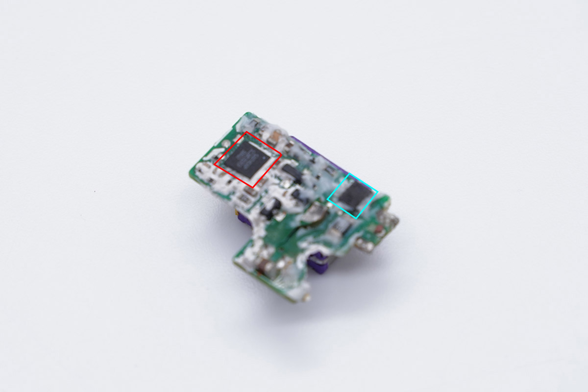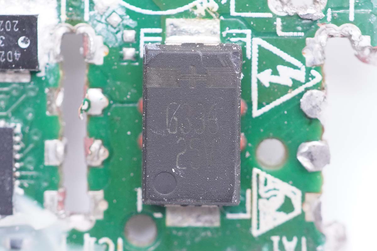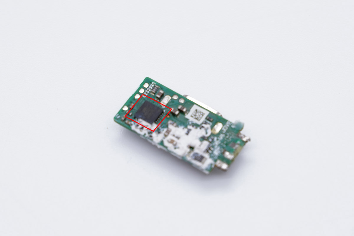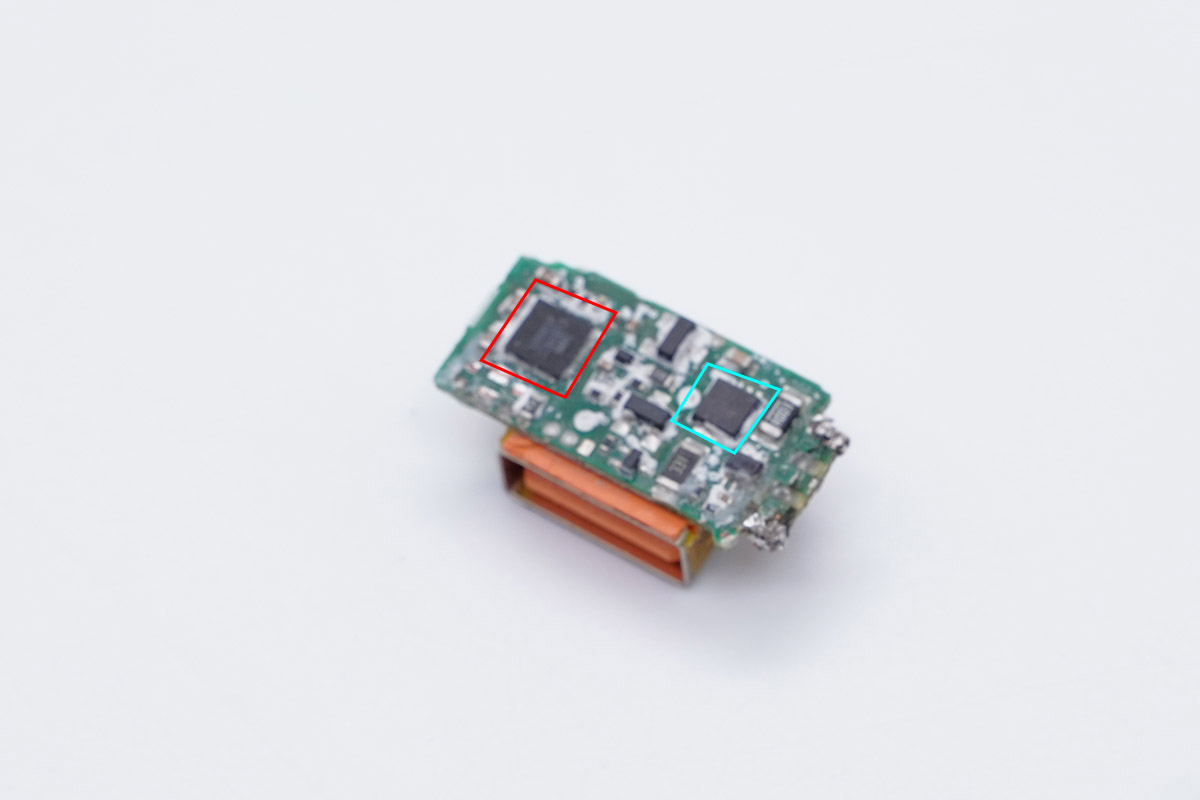 USB-C接口所在的小PCB板背面是一颗协议芯片和一颗六脚芯片。
