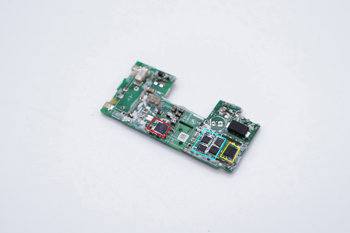 拆下所有的接口后,主PCB板正面初级侧有一颗开关电源主控芯片(红框),这是一颗ACF控制芯片。次级侧还有一颗叠层电容和同步升降压电路,一颗升降压控制器(黄框)搭配四颗MOS管(蓝框)组成,通过使用升降压电路支持USB-A口快充。