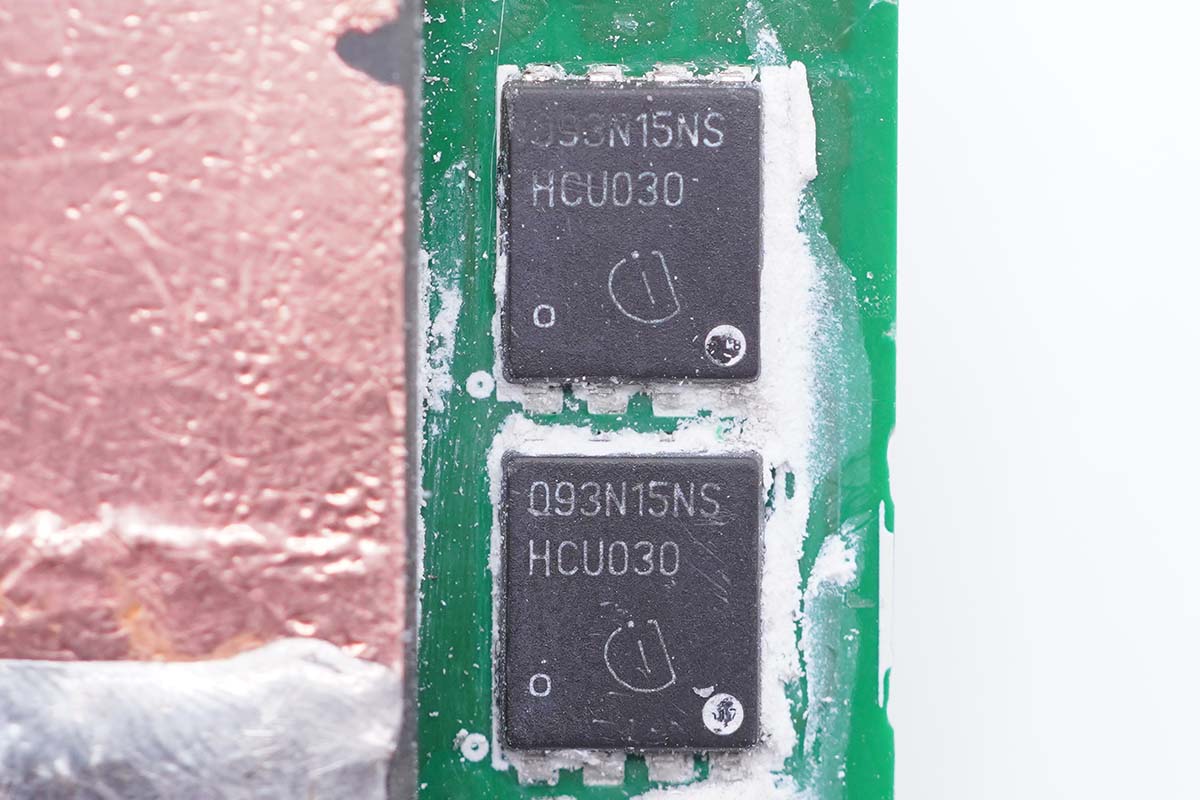 两颗同步整流MOS管,为英飞凌品牌,BSC093N15NS,耐压150V,导阻9.3mΩ,SuperSO8封装。
