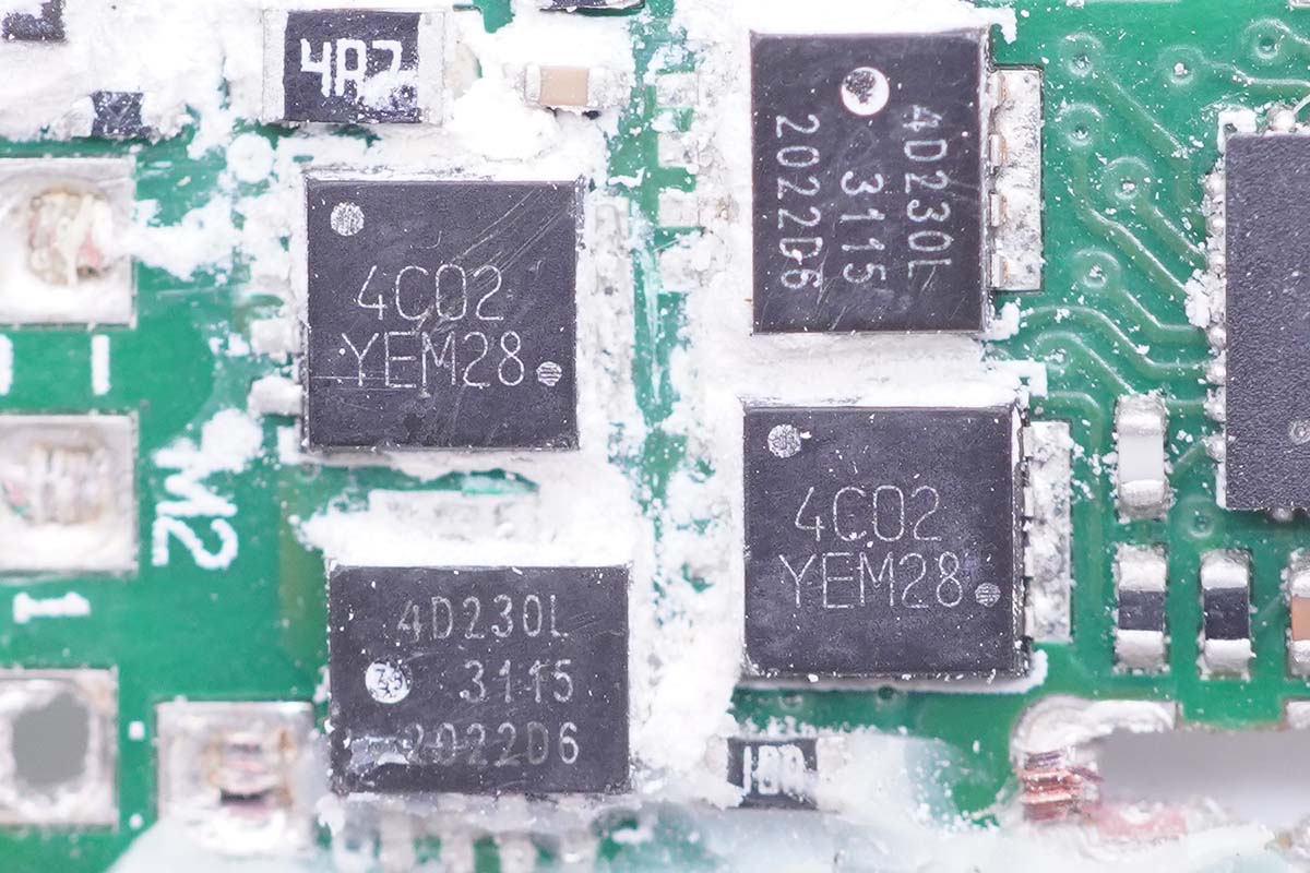 四颗同步升降压MOS管,对角的两颗芯片品牌型号一致。