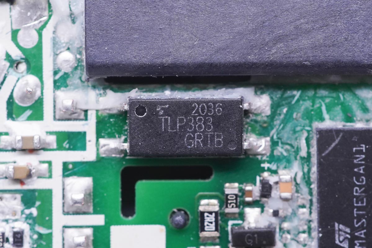 氮化镓芯片旁边是一颗光耦,东芝TLP383,用于输出电压调节及反馈。