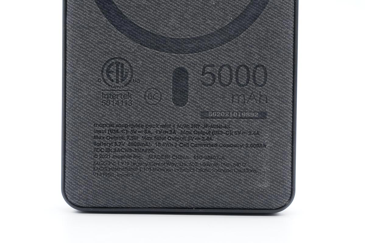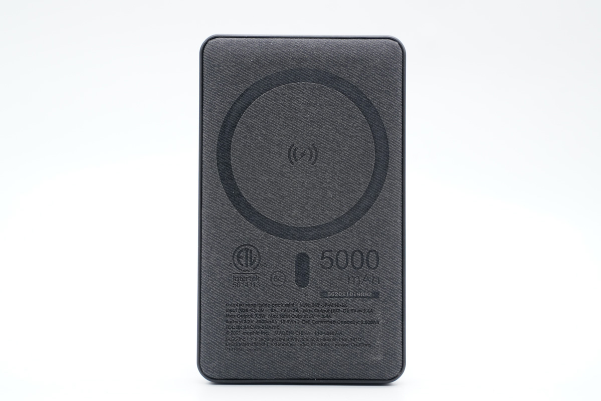 从壳体上的参数可以看出,mophie磁吸无线充电宝的型号为SNP-JP-MINI-5K,电池容量为5000mAh,USB-C支持18W自充输入,支持12W输出。支持7.5W无线输出,总输出为5V2.4A。