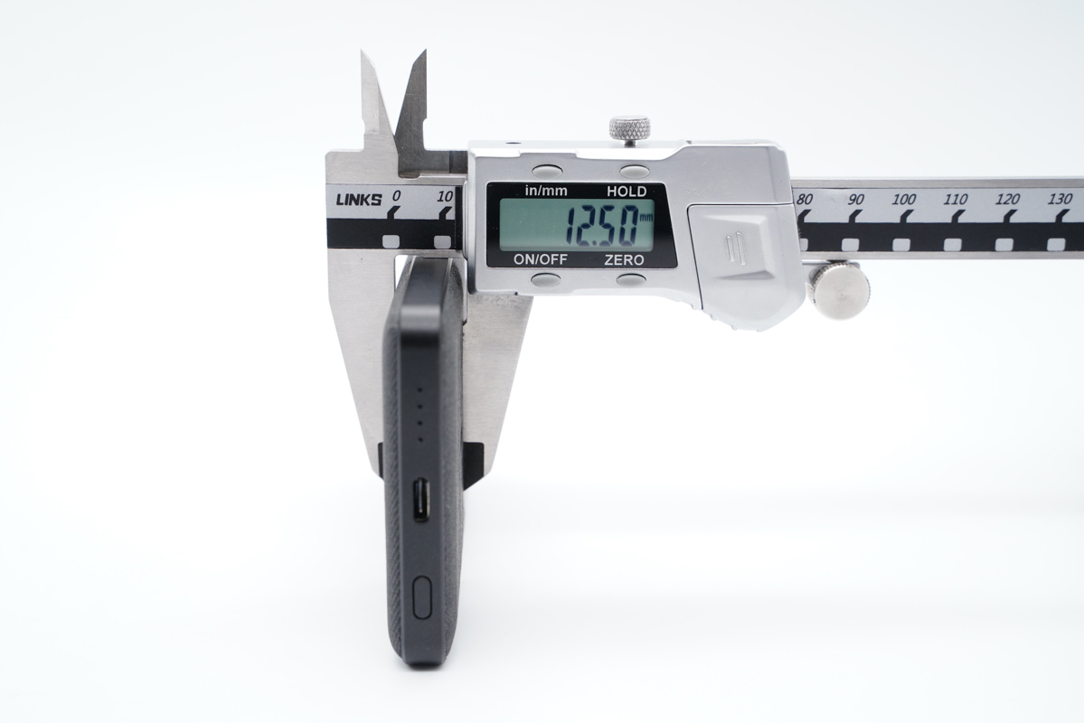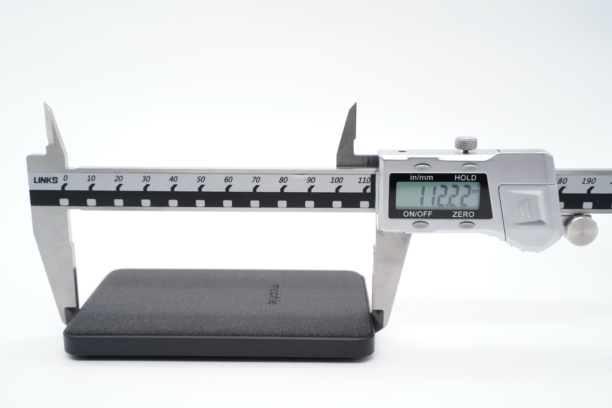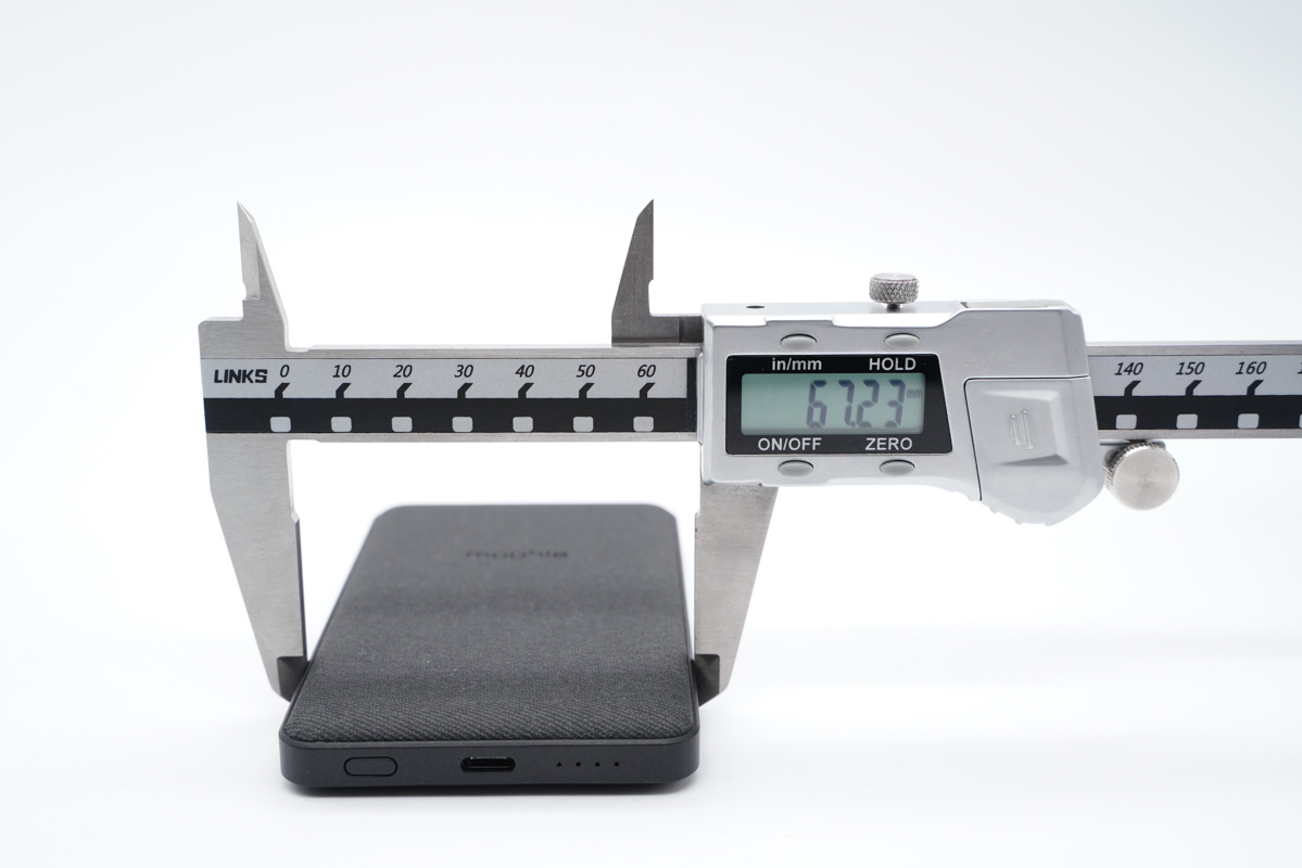 使用卡尺实测mophie磁吸无线充电宝的长度约为112.22mm。