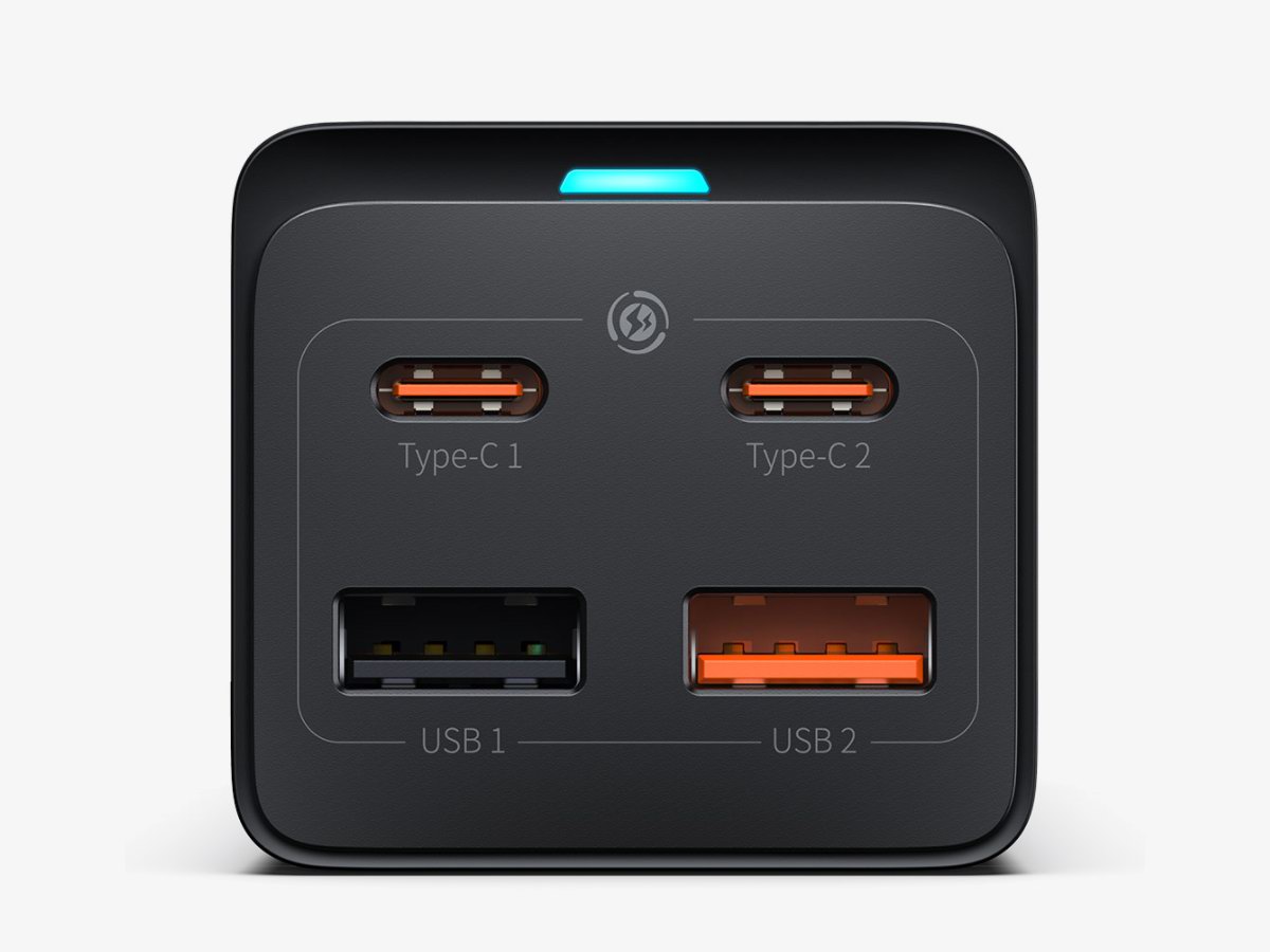 面板上可以看到,顶部是一颗冰蓝色工作指示灯,一眼即可知道当前电力通/断状态,冰蓝色也是倍思氮化镓快充家族专用的指示灯颜色,具有很高辨识度。直流输出模块包含2C2A共四个输出口,很贴心地使用了橘色母座进行快慢充划分,让用户一眼就知道接口性能,方便区分快充设备的插入。