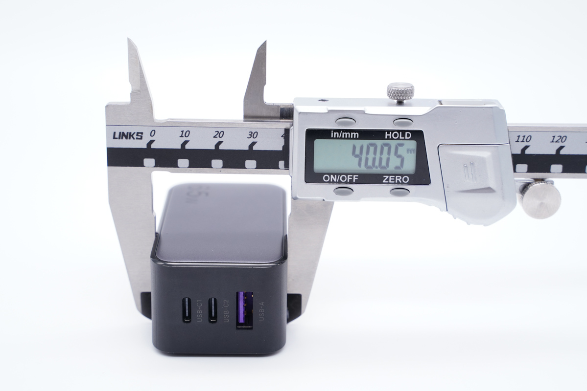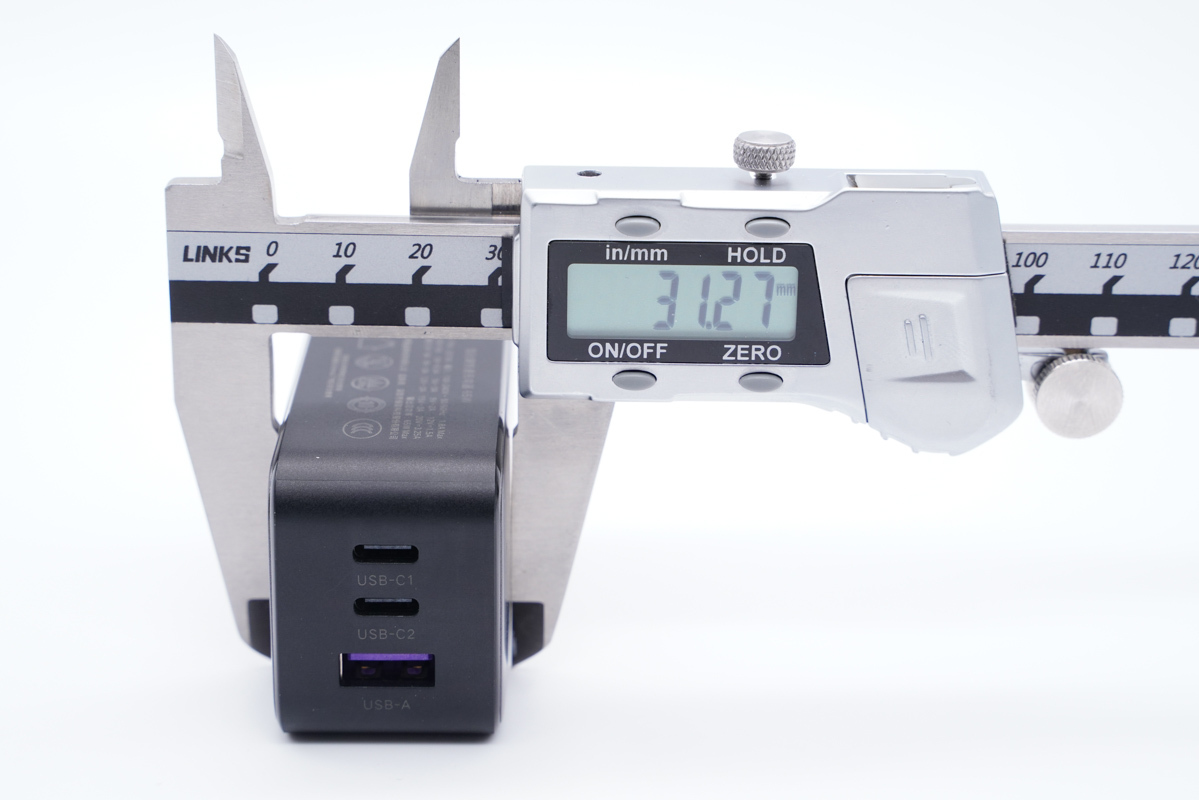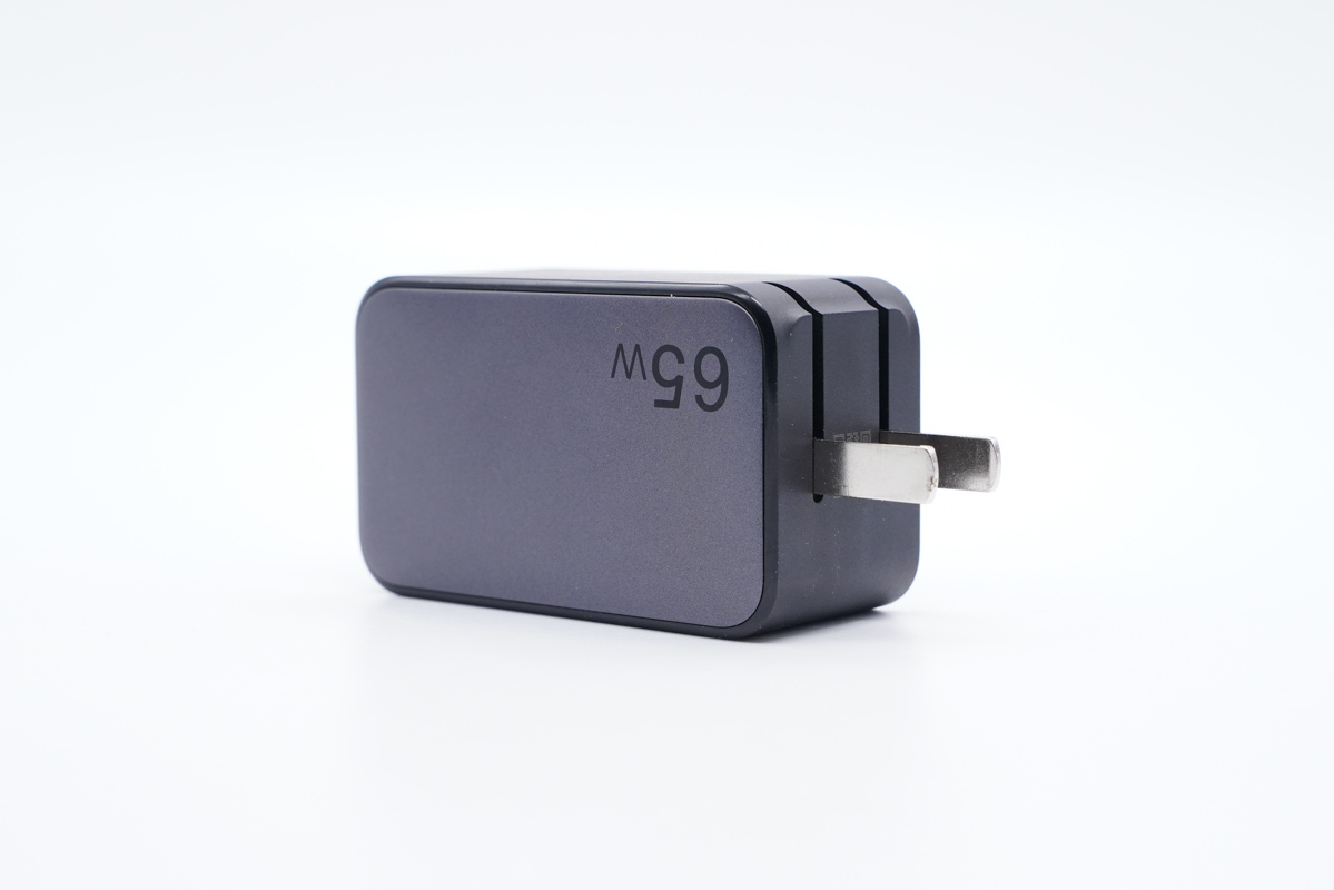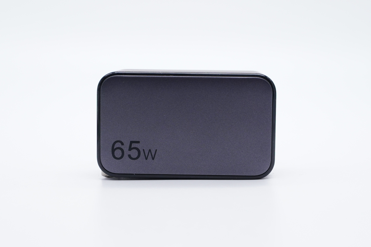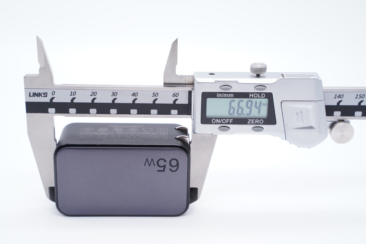 可以得知充电器的三围参数为66.94x40.05x31.27mm,体积约为83.87cm³,以最高输出65W计算,功率密度约为0.77W/cm³。