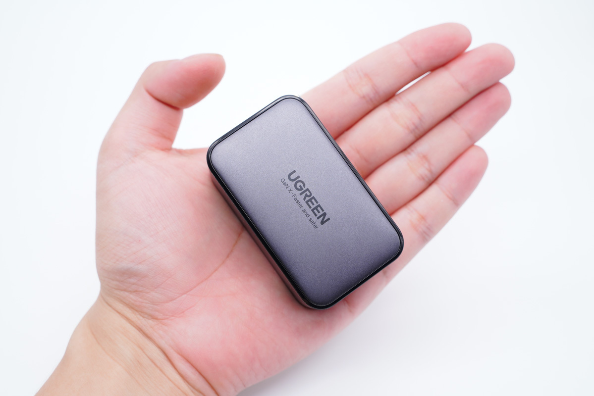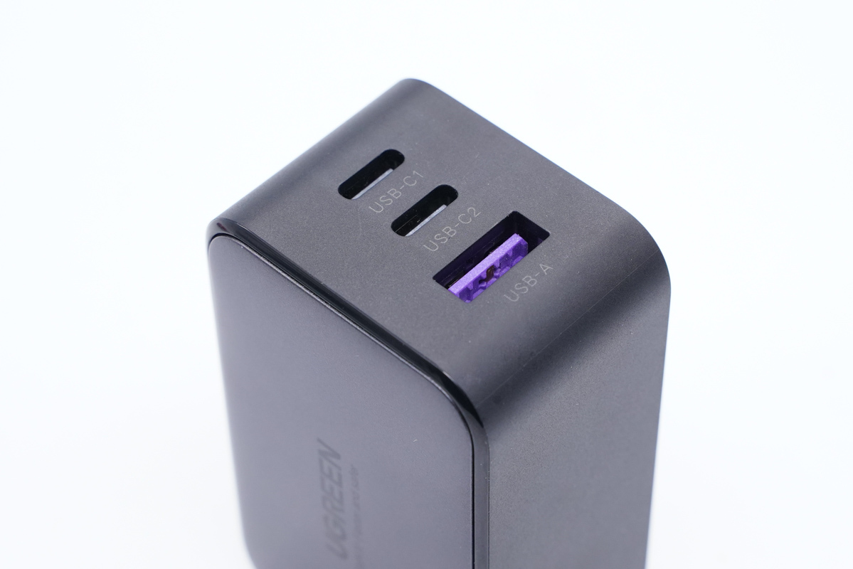 来看今天的主角,充电器外形并没有采用常规的设计,常见的长条状的充电器均以四周面与面的交界处过渡圆润为主体,插脚和接口面板削平的设计。而UGREEN绿联的这款充电器则恰恰相反,给人一种耳目一新的感觉。