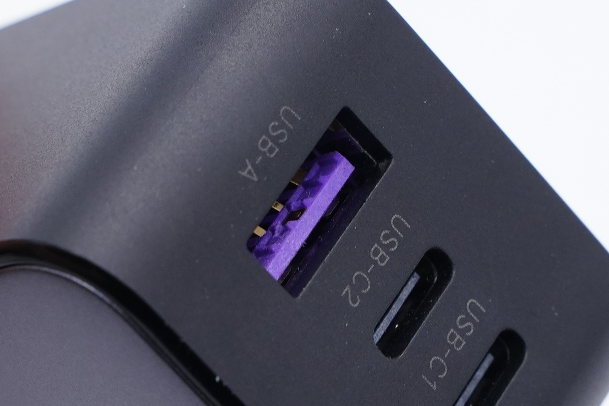 USB-A接口内部为紫色的内舌,符合华为快充的特征,并且除了内部弹片加宽之外,在内舌的外侧还可以看到一个触点,想必是支持其他的快充。