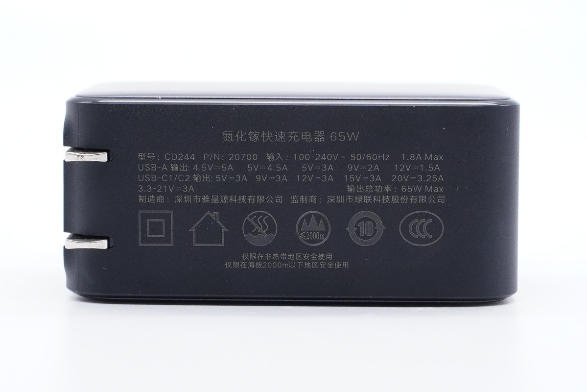 这款充电器的具体型号为CD244,支持100-240V的宽电压输入,其中USB-C1和C2支持5-20V的全电压档位,最高支持65W的输出功率和3.3-21V 3A的PPS快充。USB-A则最高支持12V输出,并支持华为的4.5V5A、5V4.5A的SCP快充档位,最高支持22.5W快充。