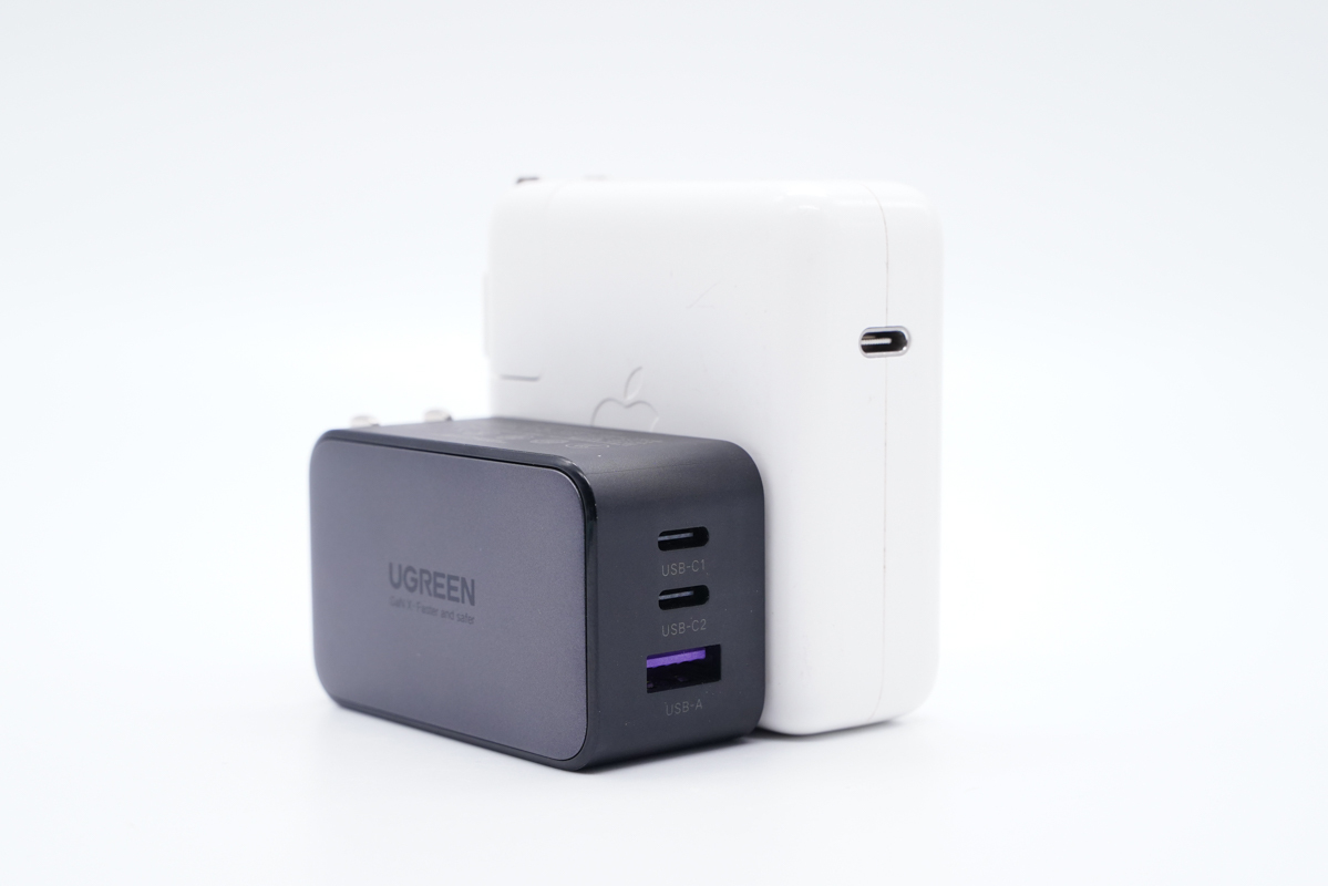 和苹果61W PD充电器放在一起对比一下,大小差距十分明显。