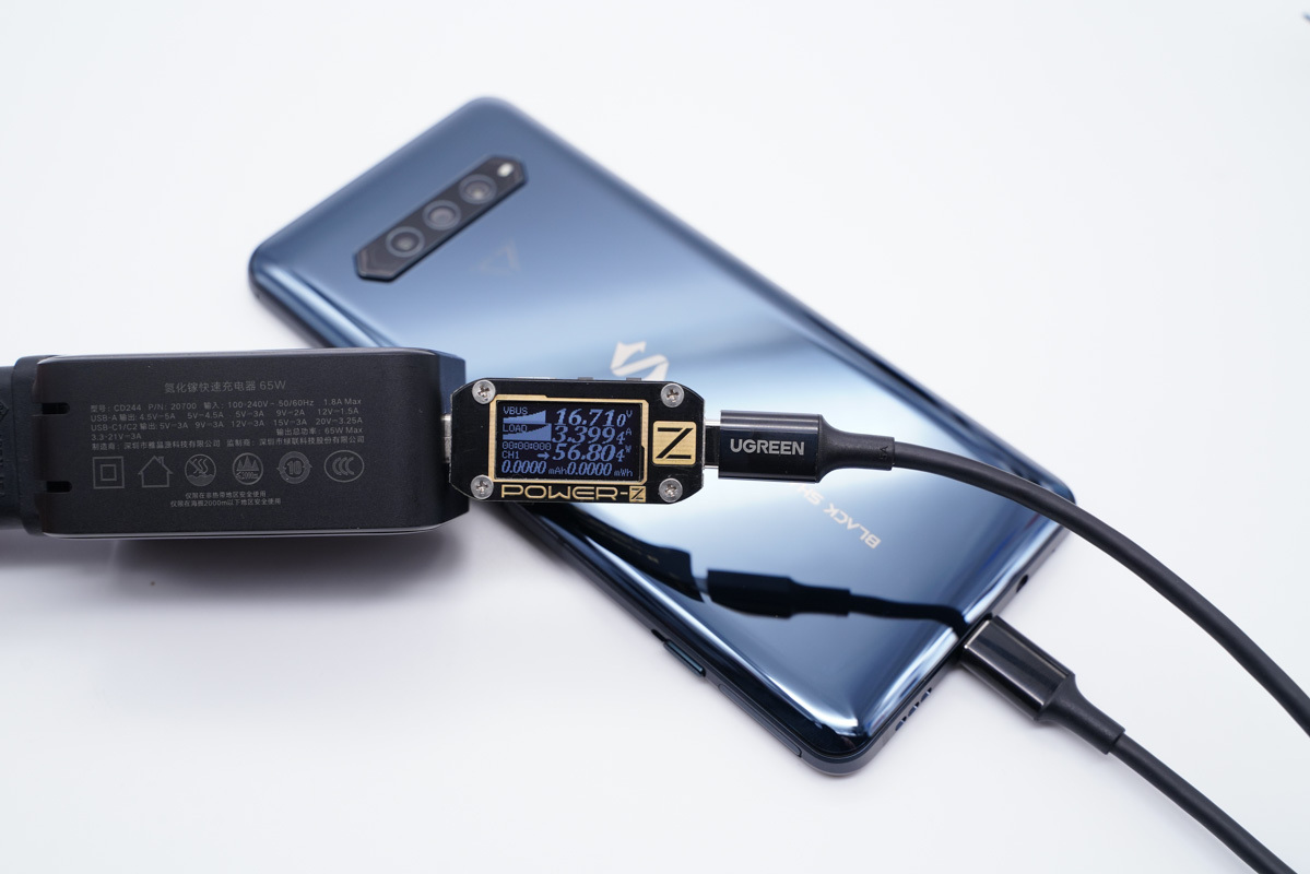 黑鲨4 Pro支持120W快充,使用USB-C为黑鲨4 Pro充电,功率为16.71V 3.39A 56.80W,此时握手PPS快充,几乎已经达到了充电器的最大输出功率。