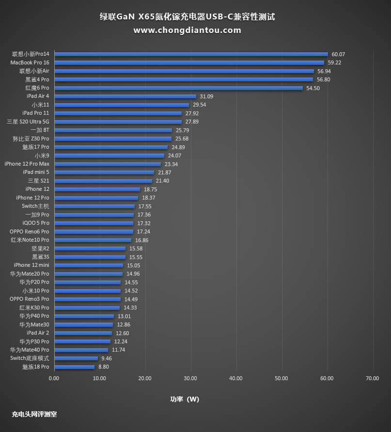 柱状图这里可以直接看出哪款设备的功率最高,笔记本电脑的功率自然排在前面,而且黑鲨4 Pro和红魔6 Pro的功率也在50W以上,表现不错。