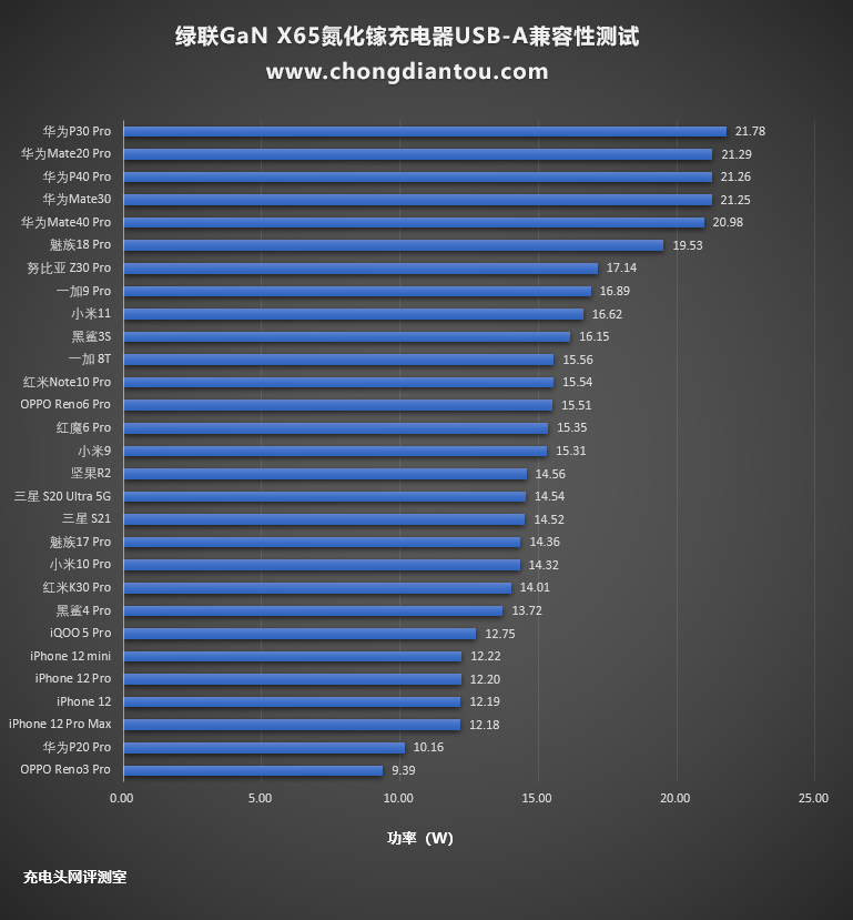 USB-A支持22.5W SCP快充与18W快充,所以整体来看柱状图的走向较为平缓,部分机型由于没有握手快充,所以功率在10W左右。