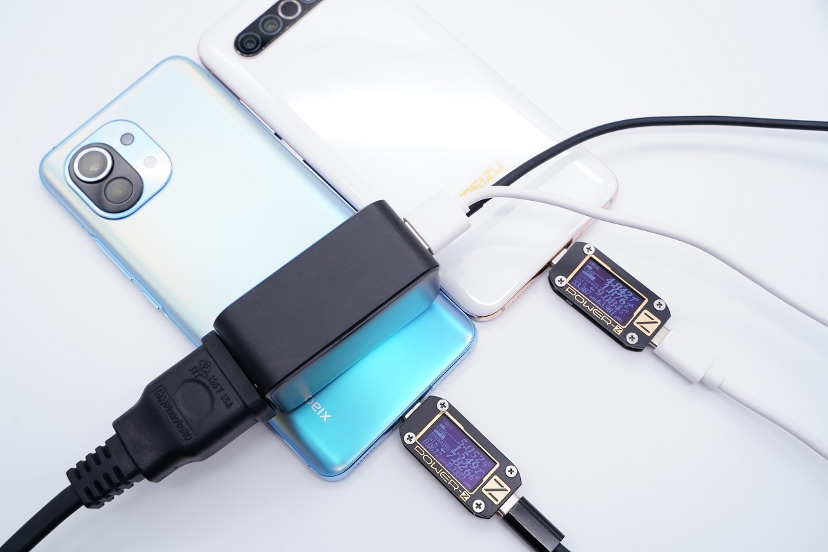 最后同时使用三个接口为三台设备充电,实测可以正常充电,具体的功率分配为45W+5V4A。
