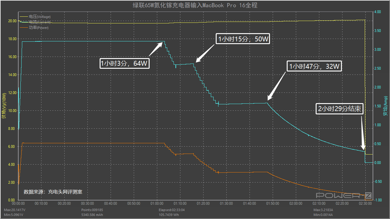 以上是使用充电器为MacBook Pro 16充电的实测全程,可以看到电压、电流以及功率的变化,全程耗时2小时29分。