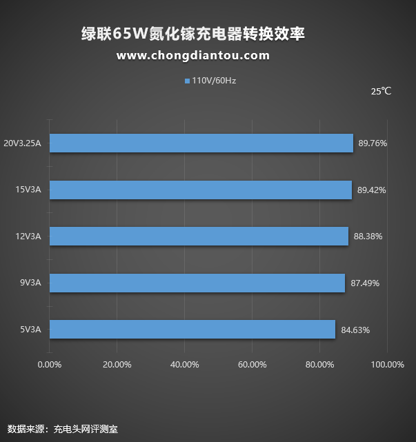 110V 60Hz下,充电器的转换效率从84.63%到89.76%不等。