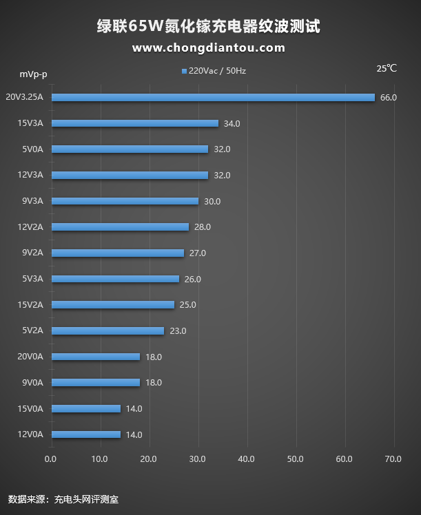 这是使用UGREEN绿联65W氮化镓充电器在220V 50Hz交流输入下的纹波测试,纹波测试分为空载(柱状图中Y轴电流为0A)和重载(柱状图中Y轴电流为非0A)两种。纹波最高为66mVp-p,充电器处于20V3.25A输出状态;最低为14mVp-p,充电器处于12V0A空载状态。
