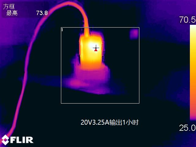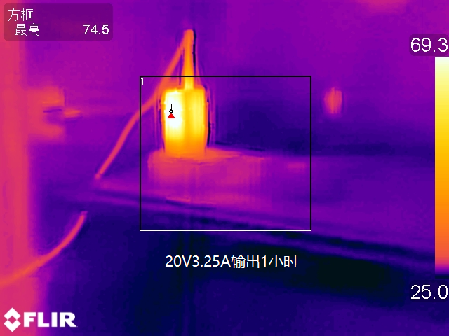 在让充电器以20V3.25A 65W的功率持续满载输出1小时后,采集到充电器表面的最高温度为74.5℃。