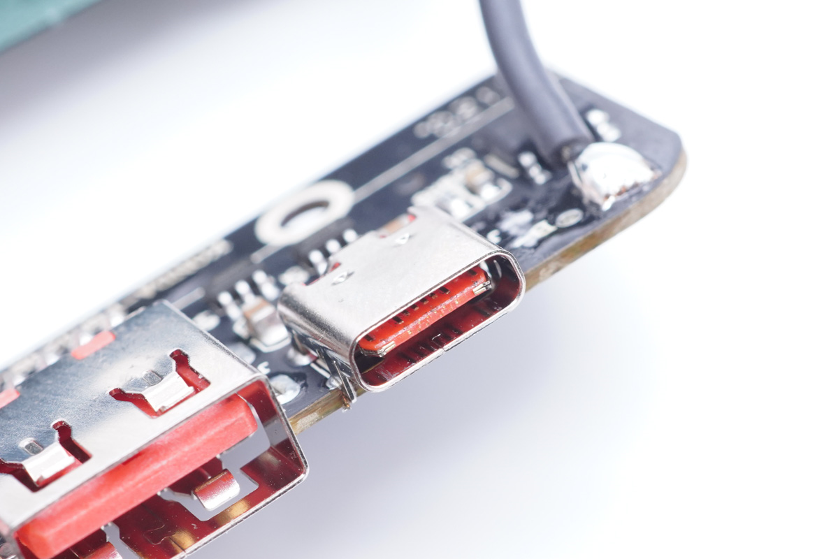 USB-A母座特写,沉板过孔焊接,前端具有特殊触点且正负极加宽。