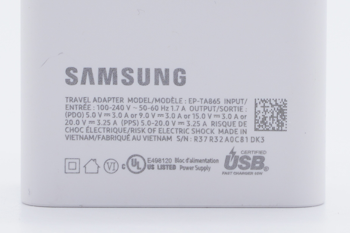 这大概是三星为数不多的大功率充电器了,三星65W充电器采用常规的外观设计,固定美规插脚,配备单USB-C物理输出接口。性能方面支持5V、9V、15V、20V四个输出档位,最高65W输出功率,并且配备3.3-11V5A、3.3-16V4.3A、3.3-21V3.25A三个PPS快充档位。