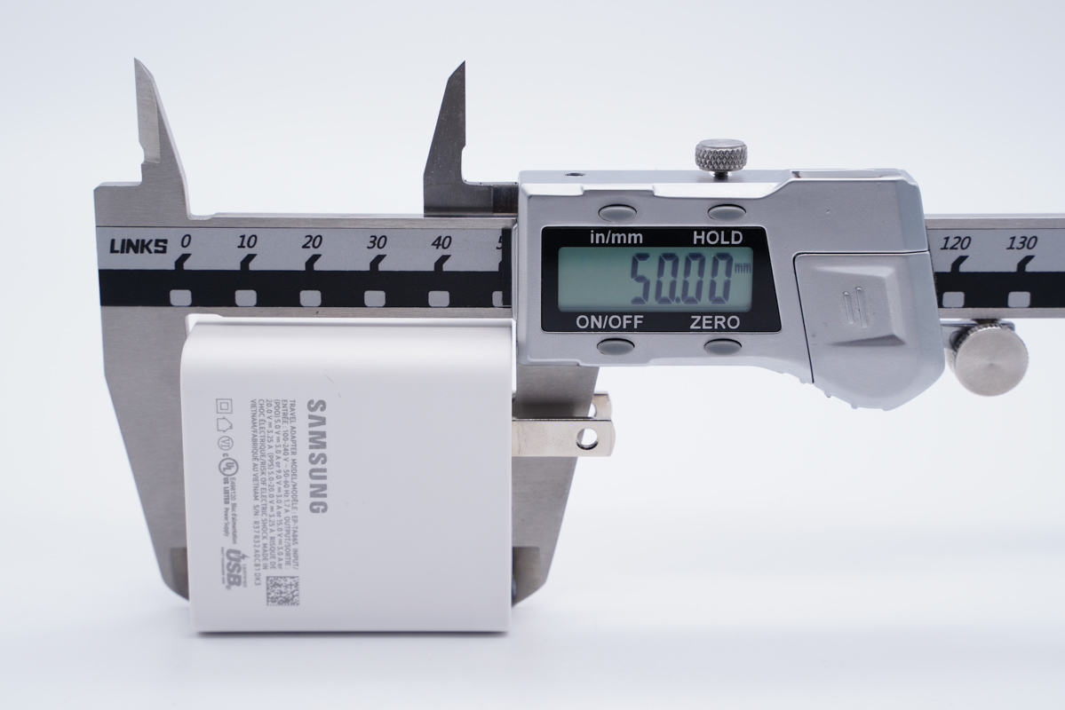 使用卡尺实测充电器的长度约为50mm(不含插脚)。