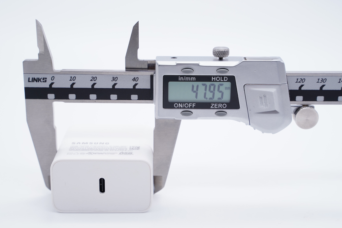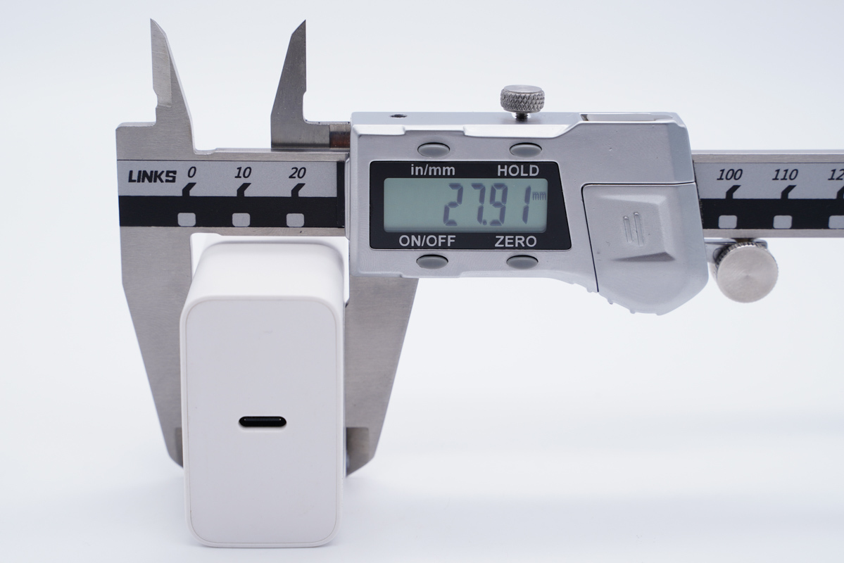 可以得出充电器的三围参数为50x47.95x27.91mm,充电器的体积约为66.91cm³,以最高输出65W计算,功率密度约为0.97W/cm³。