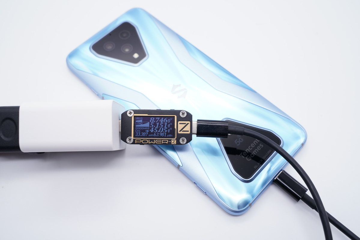 使用充电器为黑鲨3S充电,功率为8.76V 5.15A 45.05W,握手PPS快充。