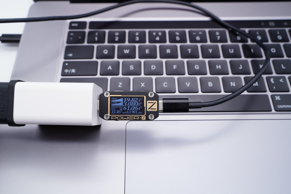 对于笔记本则可以提供纯PD快充,支持20V高压输出,为MacBook Pro 16充电功率为19.82V 3.08A 61.06W。