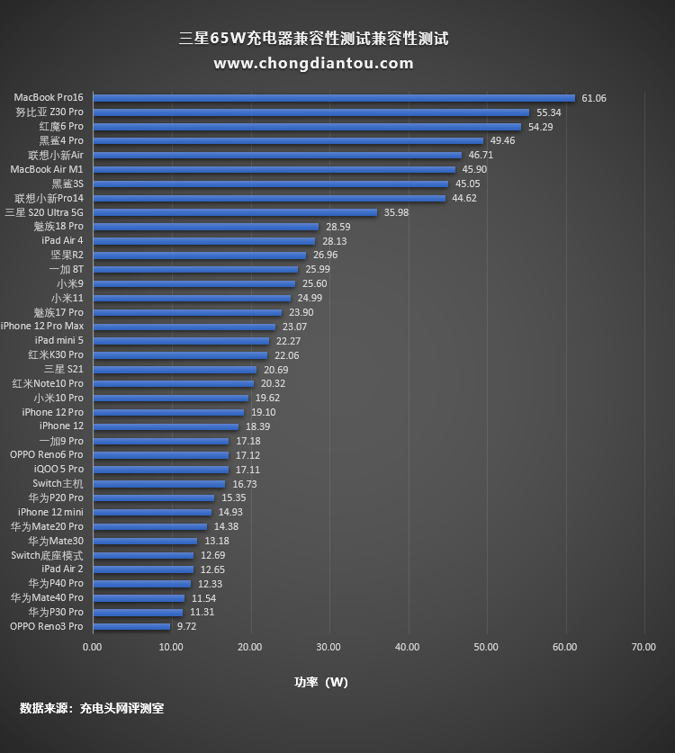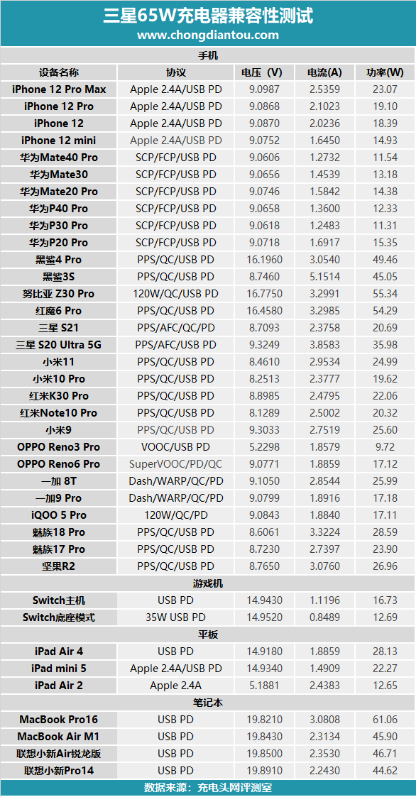 三星65W充电器充电兼容性测试
