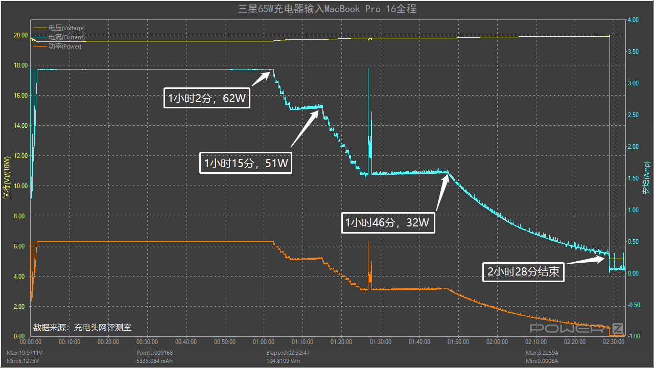 这是使用充电器为MacBook Pro 16充电的全程,每个过程都在图中详细的标注了出来,全程耗时约2小时28分。