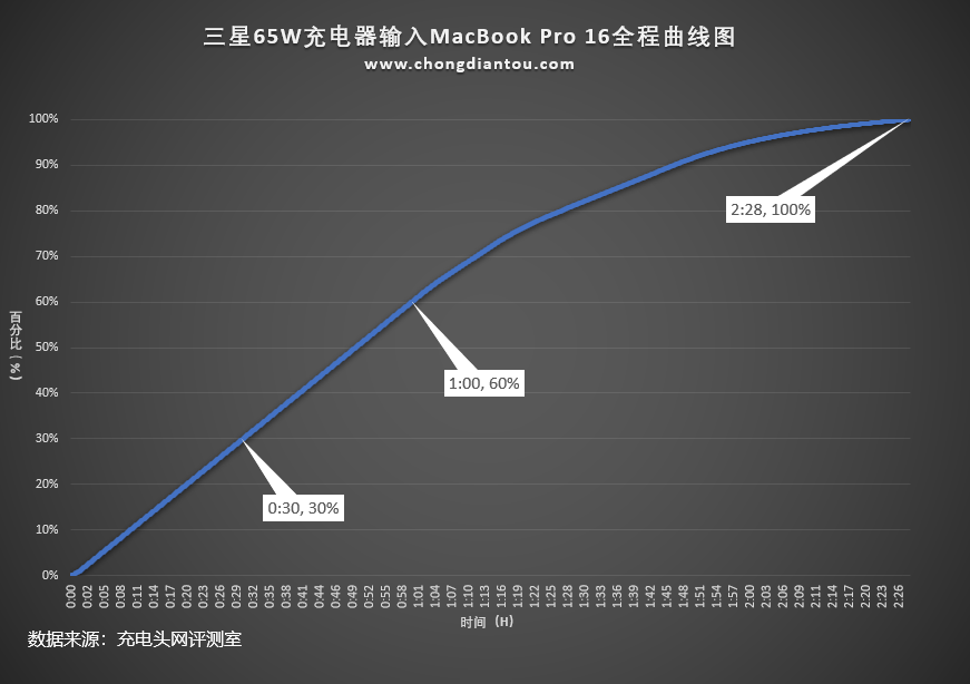 将数据绘制成曲线图,可以得知充电器为MacBook Pro 16半小时充电30%,1小时充电60%,完全充满需要2小时28分。